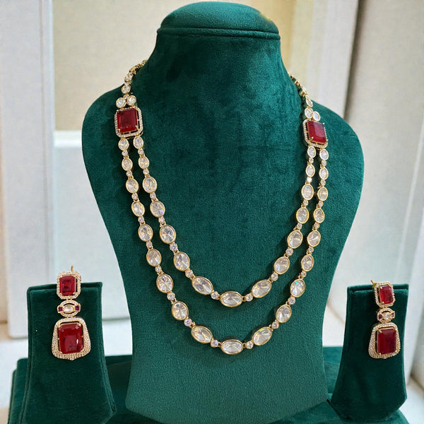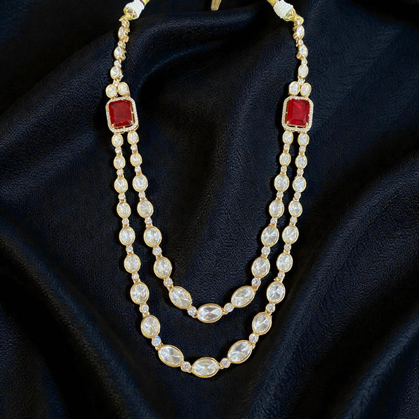 This elegant jewelry set features a refined dual-layer Polki necklace crafted with oval uncut stones framed in a golden-tone setting. The design is highlighted by two striking deep-red ruby-look stones on each side, adding richness and a bold contrast to the shimmering Polki. The matching earrings mirror the same luxurious combination of large ruby-red stones paired with Polki and delicate borders, creating a perfectly coordinated statement look. Ideal for weddings, receptions, and grand festive occasions.