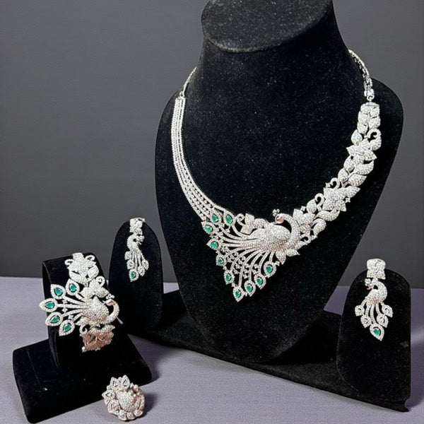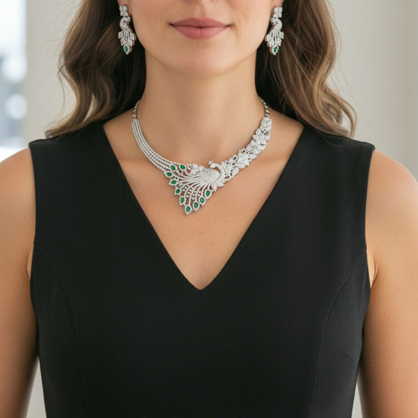 The Emerald Peacock Elegant Combo Set is a masterpiece of artistry and luxury, designed for those who appreciate fine craftsmanship. This exquisite set includes a statement necklace, matching earrings, a bracelet, and a ring, all adorned with intricate peacock-inspired elements. The necklace showcases a stunning arrangement of shimmering diamonds, forming a cascading pattern that enhances the graceful peacock design. Rich green emeralds are embedded within the feather-like structures, adding a vibrant contrast to the dazzling stones.