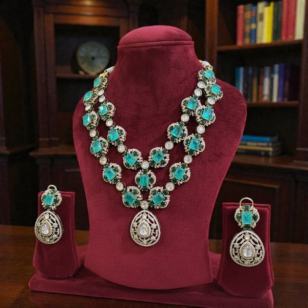 The Emerald Radiance Polki Necklace Set is a luxurious statement piece crafted for timeless elegance. Featuring double-layered strands adorned with vibrant emerald-green rectangular stones, sparkling polki-style accents, and intricate halo detailing, this set exudes regal charm. The ornate teardrop pendant showcases fine filigree work with a luminous center stone, adding depth and sophistication. Matching earrings echo the pendant’s graceful design, creating a perfectly balanced ensemble. Ideal for weddings, receptions, and festive occasions, this necklace set pairs beautifully with traditional and contemporary ethnic attire, offering a refined blend of grandeur and grace.