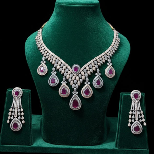 The earrings beautifully complement the necklace, featuring delicate vertical diamond strands that lead to a striking ruby drop, adding a touch of regal charm. This set is ideal for weddings, evening galas, and special celebrations, designed to make you stand out with grace and opulence.