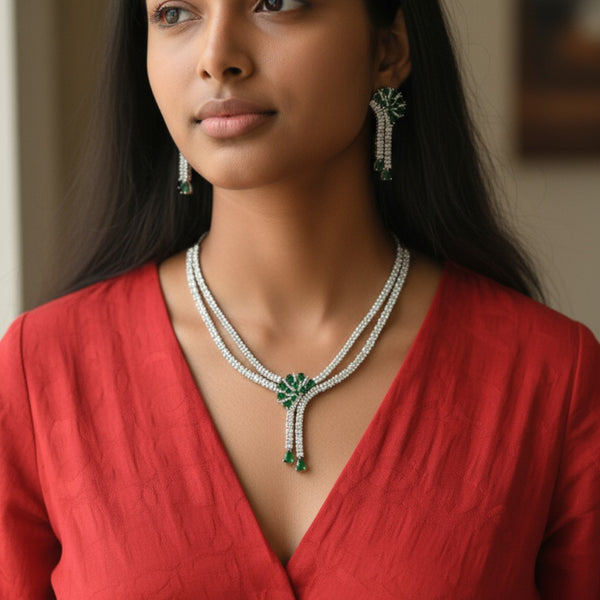 This luxurious jewelry set features a stunning double-layered american diamond necklace paired with matching earrings. The design showcases a central motif of fan-shaped emerald gemstones accented with sparkling american diamonds. The necklace’s elegant cascading drop is mirrored in the earrings, each ending with teardrop-shaped emerald stones for a refined, regal finish. Perfect for grand occasions, this set embodies sophistication and timeless glamour.