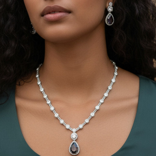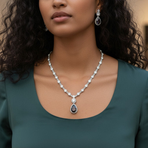 This exquisite jewelry set radiates sophistication and timeless beauty, featuring a delicate necklace and matching earrings adorned with striking deep violet teardrop gemstones, possibly amethyst or garnets. The necklace showcases an elegant chain with intricate artificial silver detailing, leading to a dazzling oval-cut white stone and a gracefully suspended violet teardrop pendant. The matching earrings mirror this refined design, each featuring a sparkling white gemstone atop a rich violet teardrop, encased in shimmering embellishments. Perfect for formal occasions, this set exudes luxury, romance, and classic charm.