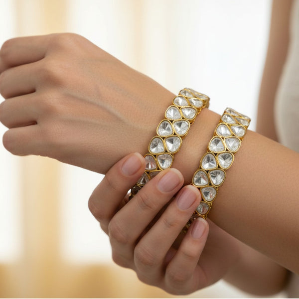 These elegant bangles are crafted with a full cluster-style arrangement of shimmering polki kundan stones set in a rich golden-toned frame.