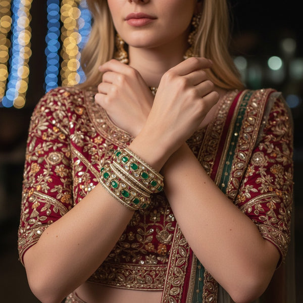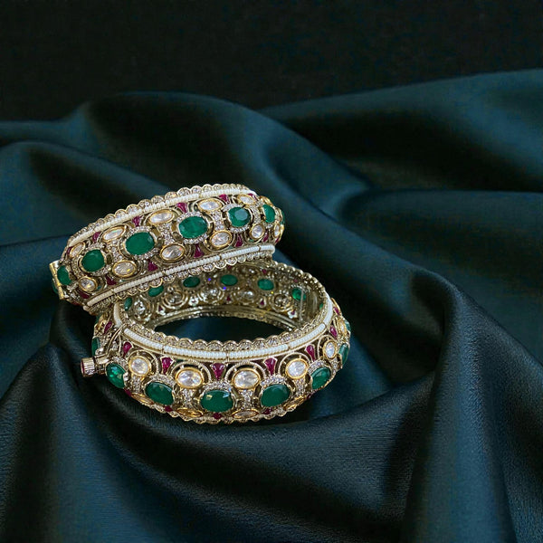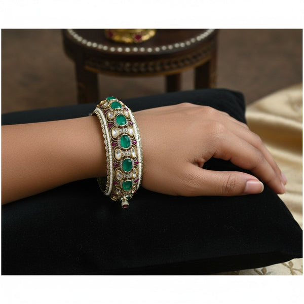 These exquisite bangles feature a rich fusion of traditional craftsmanship and royal elegance. Adorned with vibrant oval-cut emerald stones, shimmering kundan polki, and delicate ruby enamel accents, each bangle is meticulously set in an ornate golden-toned frame. Fine pearl detailing and intricate filigree work further elevate their grandeur, making them a perfect accessory for weddings, festive occasions, and heiroom collections. The secure clasp ensures a comfortable fit while maintaining the opulent aesthetic.