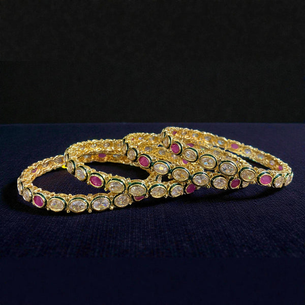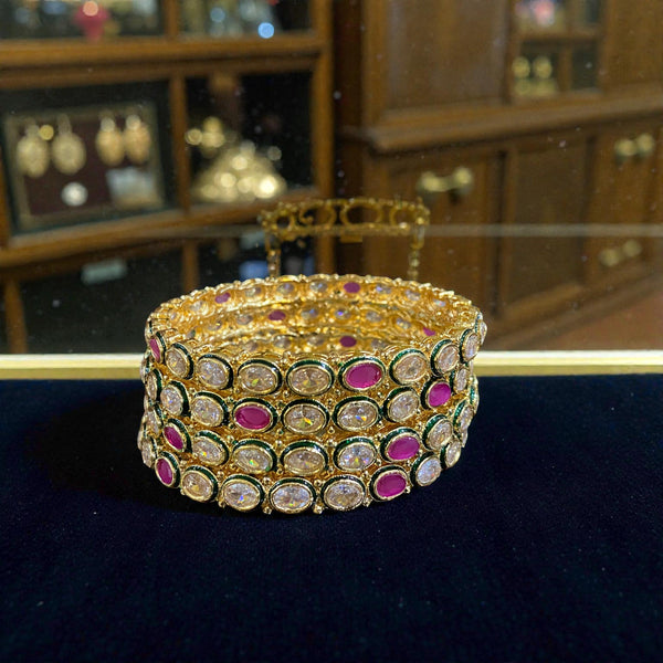 This elegant set of golden-tone bangles is adorned with shimmering oval polki-style crystals, each framed by a subtle emerald-green halo that adds depth and regal contrast. Intricately linked detailing along the band enhances the richness of the design, creating a refined balance of tradition and contemporary charm. Perfect for weddings, festive occasions, or statement stacking, these bangles bring a graceful sparkle and timeless sophistication to any ethnic ensemble.