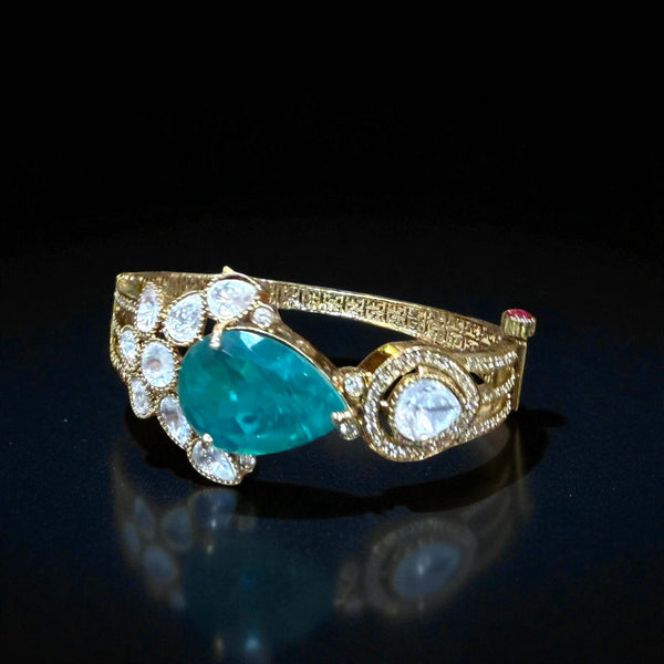 The Emerald Teardrop Royale Bracelet embodies the essence of luxury and timeless beauty. This exquisite piece is crafted in golden-plated metal and features a mesmerizing large teardrop-cut emerald stone as its centerpiece — symbolizing renewal, balance, and elegance. Surrounding it are meticulously set pear and round-shaped white kundan stones, forming a radiant floral-inspired arrangement that enhances the bracelet’s brilliance. The band is intricately detailed with fine engraving and studded with subtle stones for added sparkle, while a small ruby accent at the clasp adds a refined touch of contrast. Perfect for weddings, festive occasions, or regal celebrations, this bracelet is a statement of grace, heritage, and opulence.