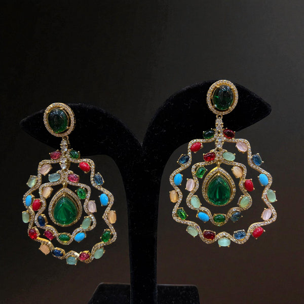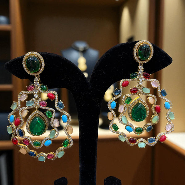 These statement chandbali-style earrings feature a stunning blend of vibrant, multi-colored gemstones arranged in an ornate, layered design. At the center of each earring sits a large pear-shaped emerald-green stone, framed with delicate pavé american diamonds for added brilliance. Surrounding it is an artistic cascade of oval and round stones in shades of turquoise, ruby red, pastel pink, sapphire blue, and soft mint, all set in a warm golden-tone base. The top stud showcases a bold deep-green cabochon encircled by shimmering american diamonds, giving the earrings a royal and luxurious appeal. Perfect for weddings, festive occasions, or statement styling, these earrings combine rich color with intricate craftsmanship for an opulent, eye-catching look.