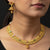 This elegant necklace set features a traditional South Indian temple design, crafted in antique artificial gold finish. The choker-style necklace showcases intricate motifs with paisley patterns, textured triangle blocks, and alternating green and pink gemstones embedded throughout. A central pendant with a hanging golden bead enhances its regal appearance. The matching jhumka earrings complement the necklace with dome-shaped drops and gemstone accents, making this set ideal for festive occasions and ethnic wear.