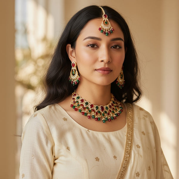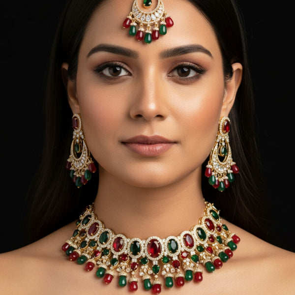 The set includes a choker-style necklace, a pair of matching earrings, and a maang tikka, each beautifully embellished with teardrop-shaped gemstone dangles. The regal design and fine detailing make it an ideal choice for weddings, festive occasions, and cultural celebrations, adding a touch of grandeur to your look.