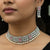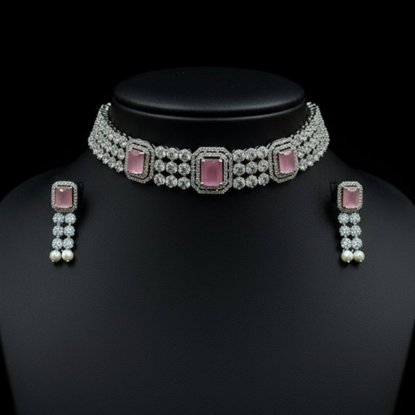 A refined fusion of sophistication and tradition, this choker necklace set radiates grace with its cool-toned elegance. The choker features rectangular pink stones framed in shimmering white crystals, linked by floral-inspired american diamond-like motifs. The lower edge is adorned with delicate white pearl droplets, adding a soft, classic charm to the piece. Matching earrings mirror the design, with a single pink stone, cascading white stones, and pearl accents. Ideal for contemporary bridal looks or festive ethnic attire, this set brings a regal yet fresh aesthetic perfect for special occasions.