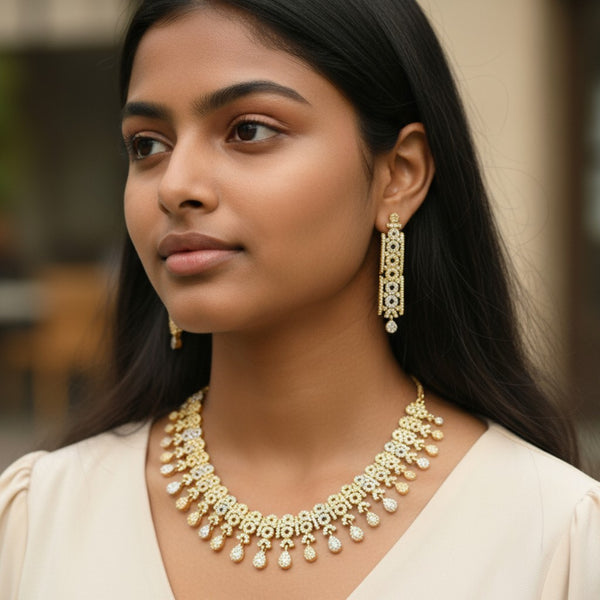 A gold-toned necklace and earring set adorned with clear stones, which are likely cubic zirconia or a similar simulant. The necklace features a repeating pattern of linked elements, each with a central clear stone surrounded by smaller stones, creating a bib-like shape that widens in the center and tapers towards the ends. Teardrop-shaped pendants, also set with clear stones, dangle from the necklace's bottom edge. The matching earrings mirror the necklace's design, featuring a central section with clear stones and a small teardrop pendant. The jewelry is elegantly displayed on black velvet stands, which accentuate the gold tone and the sparkle of the stones.
