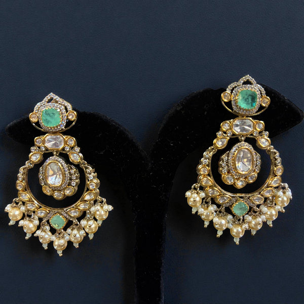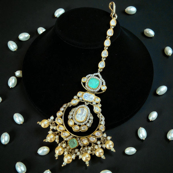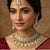 The design highlights intricate Kundan work paired with square emerald-green stones and clusters of golden pearls that add richness and movement.