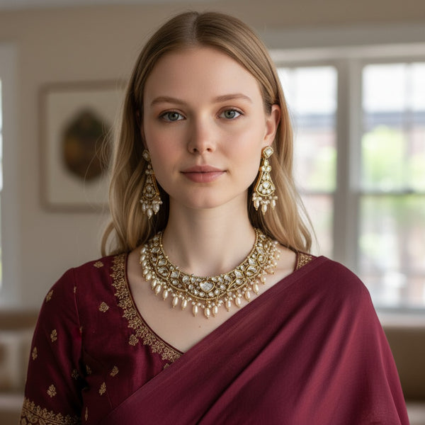 Paired with elegantly designed statement earrings, this set effortlessly complements traditional, fusion, and Indo-western ensembles, elevating your overall look. Whether you're attending a wedding or a grand event, the Pearl Royalty Kundan Set ensures you shine with unmatched sophistication and charm.