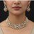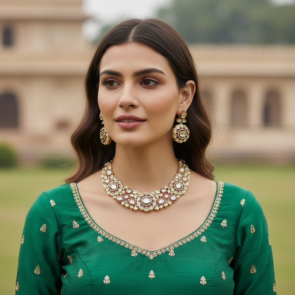 This stunning necklace set is a masterpiece of traditional Kundan craftsmanship, featuring an intricate arrangement of uncut white stones bordered with rich ruby-red enamel accents. The necklace is designed in a regal crescent shape, highlighted with floral and geometric motifs that radiate elegance. Matching earrings complement the design, adorned with bold central stones encircled by delicate detailing. Perfect for weddings and grand occasions, this set exudes timeless royal charm and sophistication.
