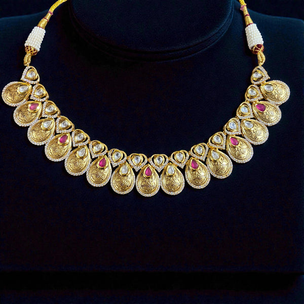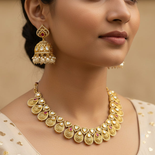 This regal necklace set features a stunning arrangement of golden-tone teardrop motifs intricately engraved with traditional patterns. Each pendant is beautifully accented with ruby-red stones and radiant kundan polki elements, creating a rich and royal aesthetic. The matching jhumka earrings are adorned with kundan work and clusters of lustrous pearls, adding a grand and graceful finish. Perfect for weddings and festive occasions, this set brings timeless elegance and classic Indian craftsmanship to any look.