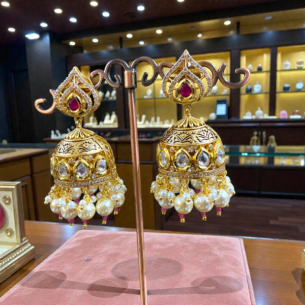 The matching jhumka earrings are adorned with kundan work and clusters of lustrous pearls, adding a grand and graceful finish.