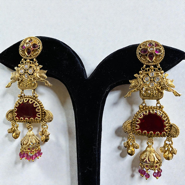 These Antique Peacock Meenakari Jhumka Earrings are a beautiful blend of heritage design and artisanal detail. Crafted in an antique golden-tone finish, the earrings feature intricate peacock motifs and floral kundan-style accents at the top. The soft pastel pink meenakari panel adds a subtle contrast, while ornate golden detailing and classic jhumka drops with tiny pearl danglers bring graceful movement. Perfect for weddings, festive occasions, and traditional celebrations, these statement earrings pair elegantly with sarees, lehengas, and ethnic ensembles, offering timeless charm and royal elegance.
