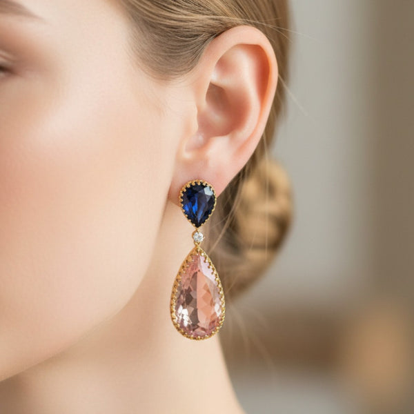 The Crimson Aura Teardrop Earrings radiate bold elegance with their deep pink teardrop stones, beautifully faceted to catch and reflect light. Set in a refined golden-toned bezel with delicate prong detailing, each earring features a smaller matching stone at the top, linked by a subtle crystal accent for added sparkle. Striking yet sophisticated, these earrings are perfect for evening wear, festive celebrations, and special occasions where you want to make a graceful statement with timeless glamour.