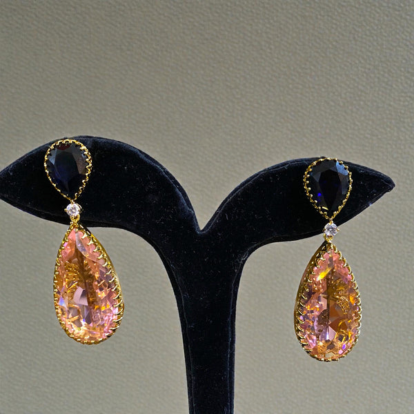 The Crimson Aura Teardrop Earrings radiate bold elegance with their deep pink teardrop stones, beautifully faceted to catch and reflect light.