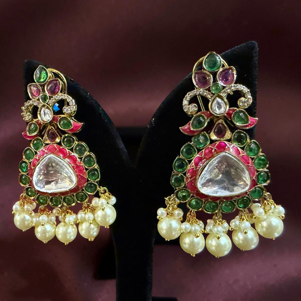 A magnificent pair of handcrafted chandelier earrings showcasing the timeless beauty of Polki artistry. At the center sits a luminous teardrop Polki stone, surrounded by a vibrant halo of ruby-toned stones and emerald accents that create a regal contrast. The intricate upper motif features delicate scrollwork with sparkling details, enhancing the traditional royal aesthetic. Finished with graceful emerald bead drops and tiny pearl clusters, these earrings bring movement, richness, and grandeur—perfect for weddings, festive occasions, and heirloom-inspired styling.