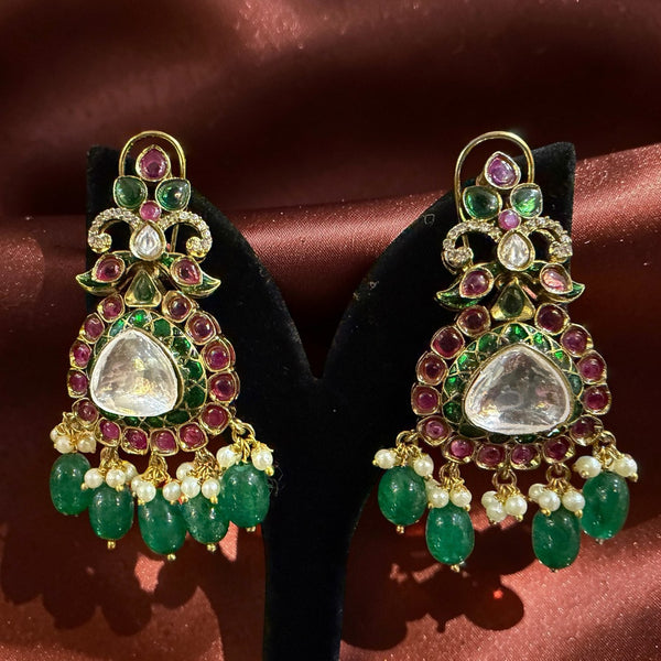 Finished with graceful emerald bead drops and tiny pearl clusters, these earrings bring movement, richness, and grandeur—perfect for weddings, festive occasions, and heirloom-inspired styling.