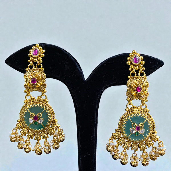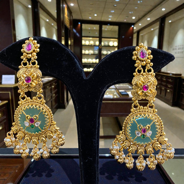 These Meenakari Heritage Golden Chandbali Earrings showcase classic Indian craftsmanship in a rich golden-tone finish. Designed with intricate floral motifs, the earrings are accented with ruby-pink and emerald-green stones set against a beautifully detailed meenakari base. Delicate golden beads and tiny pearl drops add elegant movement and a traditional touch. Ideal for weddings, festive occasions, and cultural celebrations, these earrings complement sarees, lehengas, and other ethnic outfits with effortless grace and timeless appeal.
