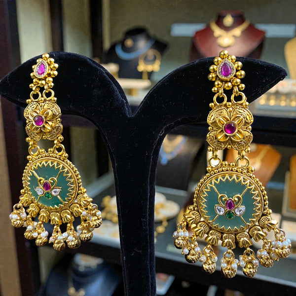 These Meenakari Heritage Golden Chandbali Earrings showcase classic Indian craftsmanship in a rich golden-tone finish.