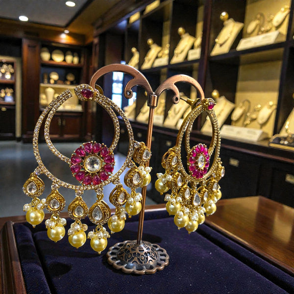 These exquisite chandbali earrings feature a graceful golden-tone circular frame encrusted with shimmering kundan stones. At the center, a floral motif of rich ruby-pink stones surrounds a radiant polki-style crystal, creating a regal focal point. Delicate pearl clusters and teardrop kundan drops cascade below, adding movement and elegance. Perfect for weddings, festive celebrations, and traditional occasions, these earrings blend classic Indian craftsmanship with timeless royal charm.