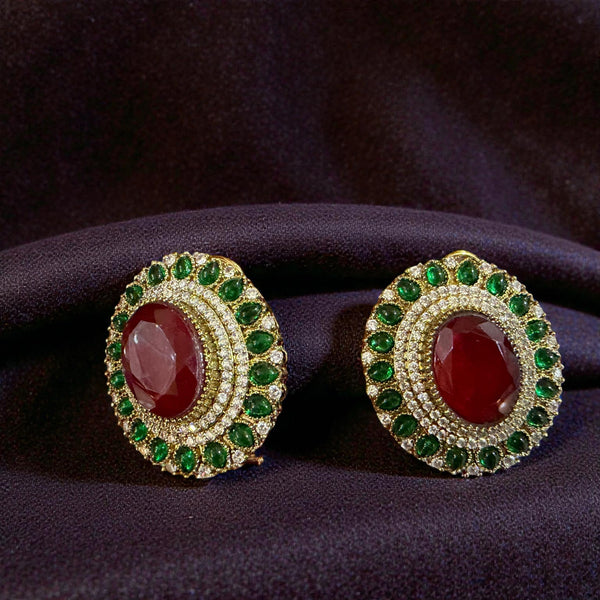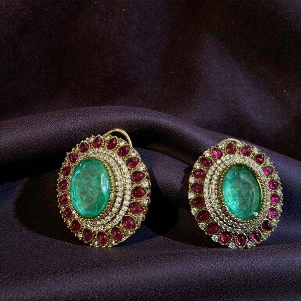 A striking pair of statement studs featuring a rich oval-cut ruby centerpiece, beautifully framed by concentric halos of brilliant american diamonds and vibrant emerald accents. Set in a luxurious golden finish, the intricate layered design enhances the depth and brilliance of each stone. Perfect for weddings, festive occasions, or evening elegance, these earrings blend royal charm with timeless sophistication.