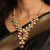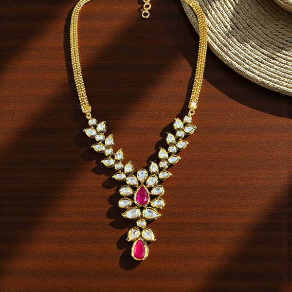 A stunning handcrafted Kundan necklace set designed with elegance and sophistication. The piece features brilliant white uncut stones arranged in floral motifs, centered around vibrant ruby-red teardrop gemstones. Set in golden plating, the necklace radiates a refined charm, complemented by matching ruby and Kundan earrings. Perfect for festive occasions, weddings, or evening celebrations, this set adds a touch of royal grace to any outfit.