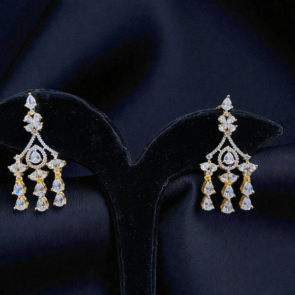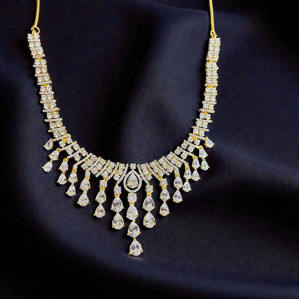 The Aarohi Teardrop American Diamond Necklace Set is a graceful blend of classic elegance and modern brilliance. Crafted in a rich golden-tone finish, the necklace features meticulously arranged rows of sparkling stones that flow into delicate pear-shaped drops, creating a soft, cascading silhouette. The matching earrings echo the same teardrop motif with refined movement and shimmer. Designed to catch the light from every angle, this set is perfect for weddings, receptions, and grand festive occasions, adding a touch of regal sophistication to any ensemble.