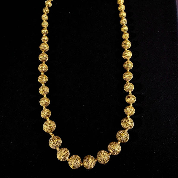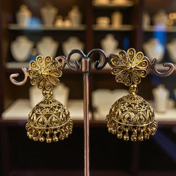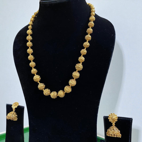 This elegant jewelry set features a beautifully crafted golden-toned necklace made of intricately designed filigree beads arranged in a graduated pattern. Each bead showcases fine lattice-style detailing, giving the necklace a rich, traditional appeal. Paired with matching jhumka earrings adorned with delicate floral tops and classic bell-shaped drops, the set exudes timeless charm. Perfect for weddings, festive celebrations, and traditional outfits, this ensemble combines heritage craftsmanship with graceful aesthetics.