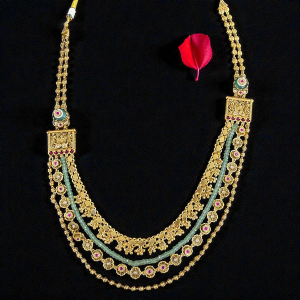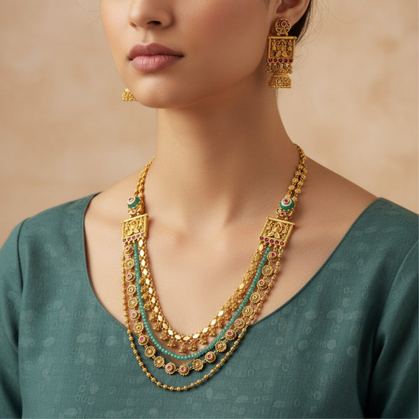 This regal necklace set is inspired by traditional South Indian temple craftsmanship, showcasing three intricately layered chains. The top layer features delicate golden floral links, the middle layer combines pastel green beads with ornate motifs, and the bottom layer highlights alternating golden and ruby-toned floral elements for a rich and colorful finish.