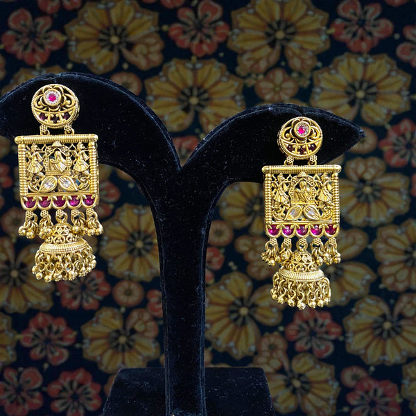 The matching earrings echo the same temple-inspired design, complete with miniature jhumki drops that add a graceful touch.