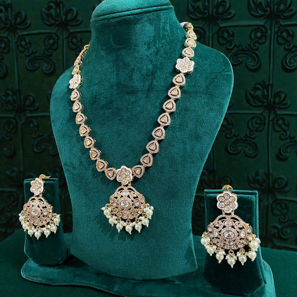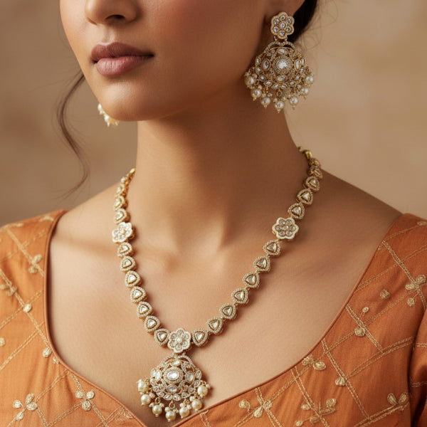 This graceful necklace set features an elegant chain of teardrop-shaped kundan motifs, each bordered with delicate detailing for a refined finish. Interspersed floral elements add charm and symmetry, leading to a beautifully crafted dome-shaped pendant adorned with sparkling kundan stones. The pendant is finished with clusters of soft pearl drops, offering a classic and luxurious look.