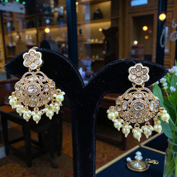 Matching earrings mirror the pendant’s intricate floral dome design and pearl embellishments, creating a perfectly balanced ensemble. Ideal for weddings, festive celebrations, and traditional attire, this set blends timeless floral artistry with regal sophistication.