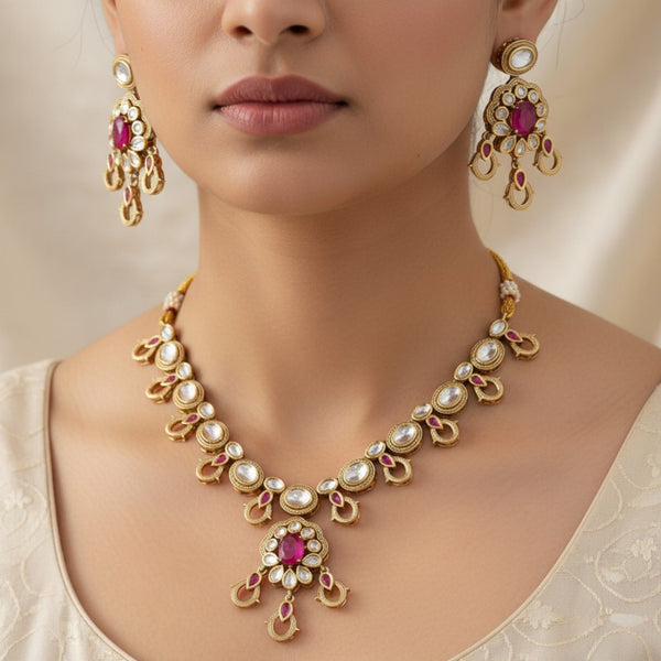 The Rangmahal Ruby Kundan Necklace Set is a classic celebration of royal Indian artistry.