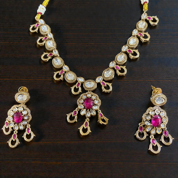 The Rangmahal Ruby Kundan Necklace Set is a classic celebration of royal Indian artistry. Designed with a graceful line of oval kundan stones, the necklace is highlighted by rich ruby-toned accents set in elegant golden-finish frames. The central pendant showcases a striking ruby centerpiece surrounded by shimmering kundan stones, finished with delicate paisley-shaped drops that add fluid movement and charm. Complemented by matching statement earrings, this set is ideal for weddings, festive gatherings, and traditional occasions, lending a timeless, heirloom-inspired elegance to your look.