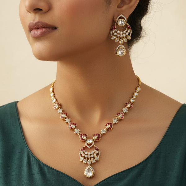The Ruby Glow Kundan Pendant Necklace Set is a graceful blend of elegance and traditional charm. Designed in a rich golden-tone finish, the necklace features delicate kundan-style stones accented with deep ruby enamel detailing. The centerpiece pendant showcases a crescent-inspired motif adorned with shimmering white stones and finished with a teardrop-shaped kundan drop for added sophistication. Matching earrings mirror the pendant design, completing the set with refined harmony. Ideal for festive occasions, weddings, and evening celebrations, this set pairs beautifully with sarees and ethnic outfits, offering a timeless and radiant appeal.