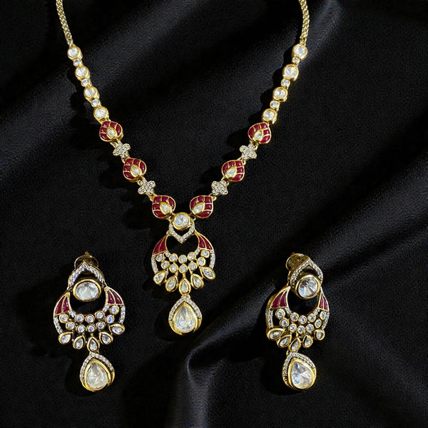 Designed in a rich golden-tone finish, the necklace features delicate kundan-style stones accented with deep ruby enamel detailing.