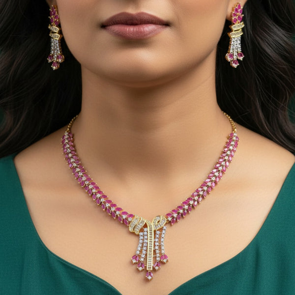 Featuring a graceful line of marquise-cut ruby-hued stones framed in a radiant golden finish, the necklace flows into a beautifully crafted central pendant adorned with shimmering american diamond-like accents and delicate ruby drops.