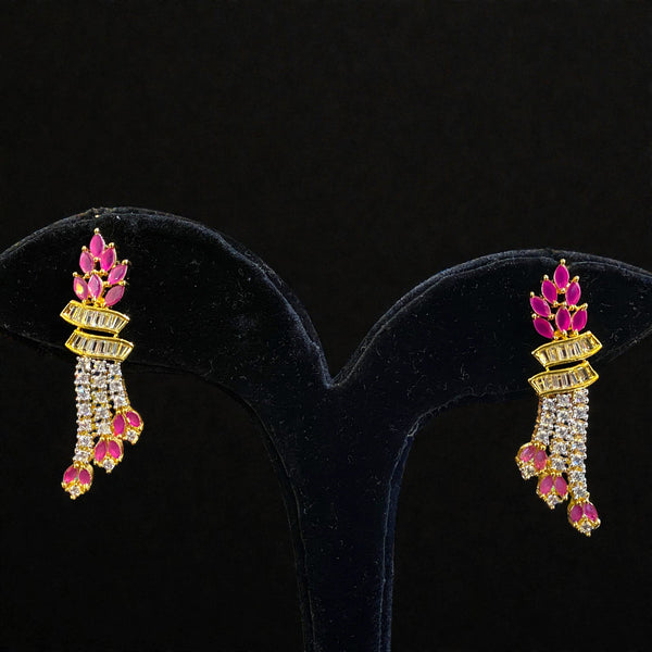 The Ruhani Ruby Cascade Necklace Set is a striking expression of elegance and refined artistry. Featuring a graceful line of marquise-cut ruby-hued stones framed in a radiant golden finish, the necklace flows into a beautifully crafted central pendant adorned with shimmering american diamond-like accents and delicate ruby drops. The matching earrings mirror the pendant’s cascading design, adding balanced sparkle and movement. Perfect for weddings, festive celebrations, and evening occasions, this set brings a rich pop of color and timeless sophistication to traditional and contemporary attire alike.