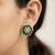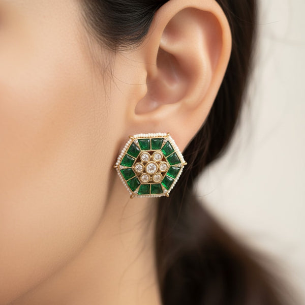 These striking hexagonal studs feature a radiant arrangement of emerald-green stones bordered by delicate pearl beading. At the center, a cluster of shimmering kundan-style polki stones adds regal charm and sparkle. Bold yet elegant, these earrings are a perfect fusion of traditional craftsmanship and contemporary design—ideal for festive occasions and ethnic ensembles.
