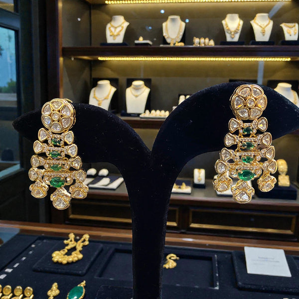 The matching earrings echo the same tiered Polki cluster pattern, completing the regal and heritage-inspired look.