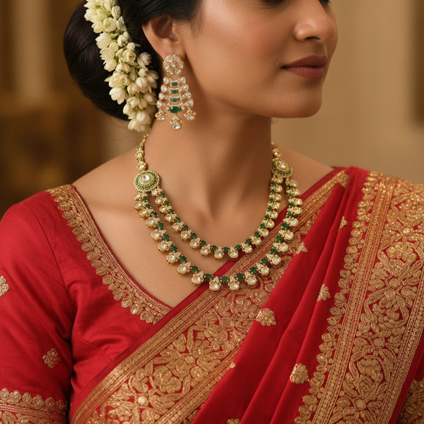 This traditional jewelry set showcases a beautifully crafted dual-layer haaram adorned with round Polki stones set in an antique gold finish. The necklace features two ornate floral side motifs embellished with intricate green enamel accents, adding depth and richness to the design. Each layer is detailed with dangling Polki clusters that create a rhythmic, luxurious drape. The matching earrings echo the same tiered Polki cluster pattern, completing the regal and heritage-inspired look. Perfect for weddings, festive occasions, and classic ethnic ensembles.