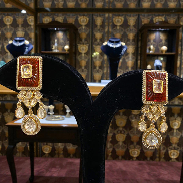 The matching earrings mirror the carved stone motif and delicate drops, completing the set with perfect symmetry.