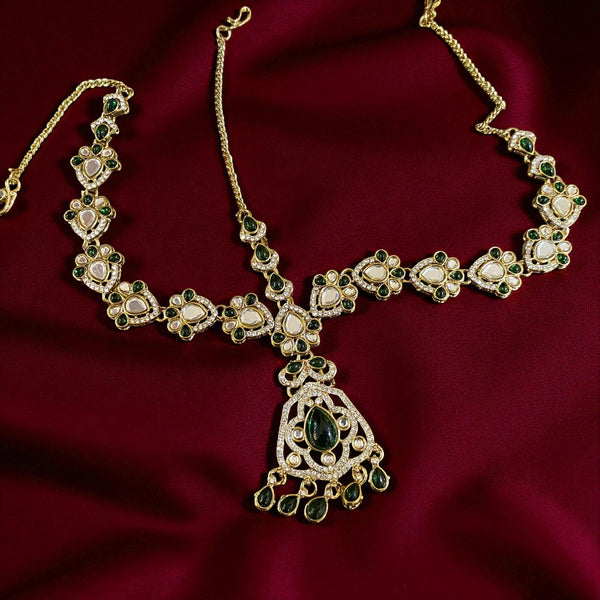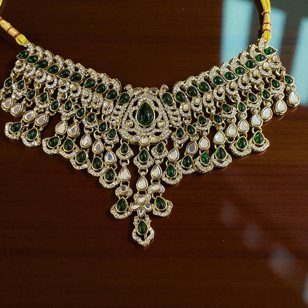• The set features a grand choker necklace adorned with shimmering white stones, intricate golden detailing, and deep emerald-green accents.