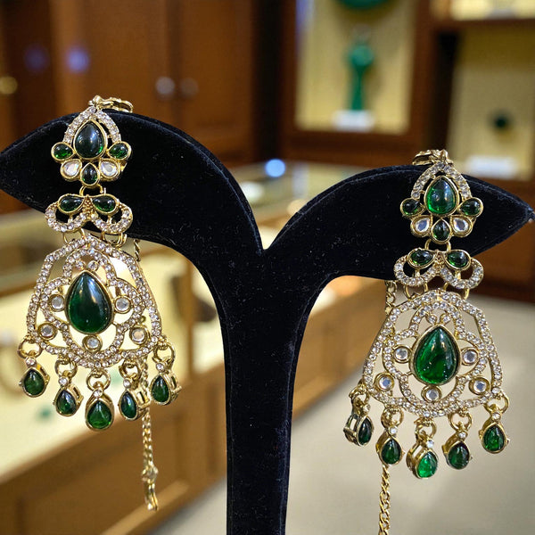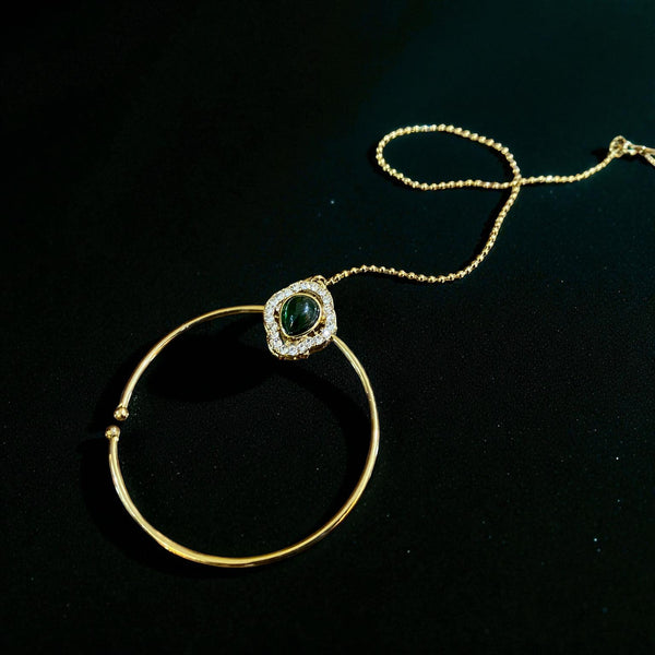 • The statement pendant at the bottom is heavily studded and framed with green teardrop stones, adding to the overall opulence.