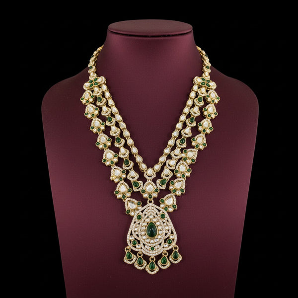 This is a lavish multi-layered bridal jewelry set designed in classic Kundan craftsmanship. The set features a grand choker necklace adorned with shimmering white stones, intricate golden detailing, and deep emerald-green accents. Below the choker hang two long, coordinated layered necklaces, each embellished with pear-shaped stones and emerald drops, creating a rich and regal cascading effect.