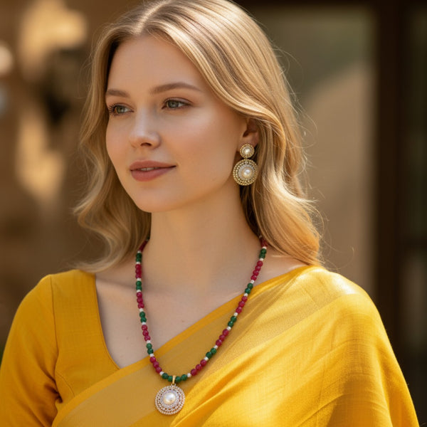 Embrace timeless elegance with this exquisite artificial Gold-Plated Pearl Jewelry Set, featuring a graceful pendant and matching earrings. At the heart of each piece lies a luminous white pearl, surrounded by a dazzling halo of intricately set sparkling stones. The intricate circular design, paired with the delicate artificial gold-plated chain accented by tiny beads, creates a look that is both sophisticated and radiant. Perfect for weddings, special occasions, or to add a touch of classic charm to your ensemble, this set is a true celebration of beauty and grace.